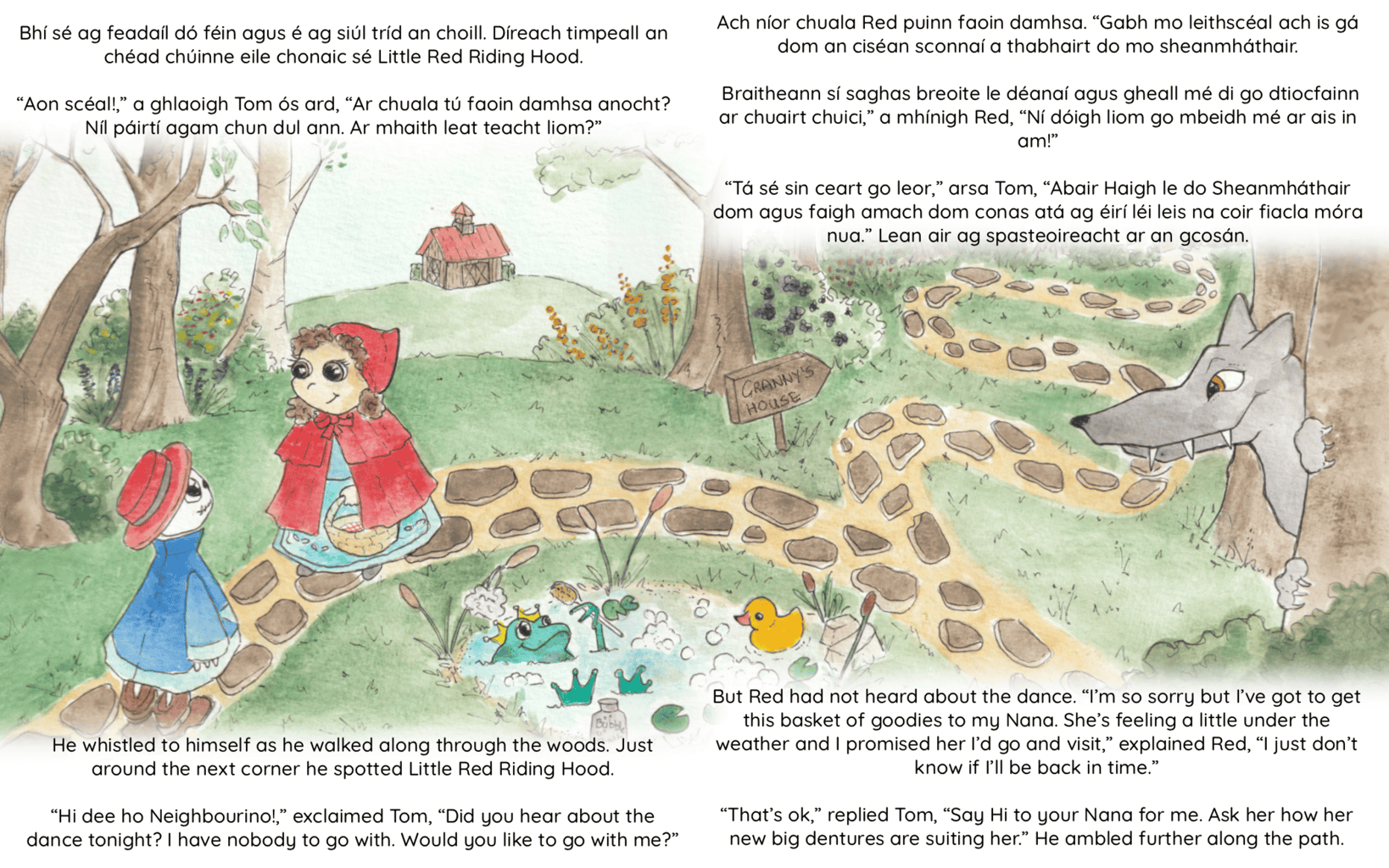Beautifully written and illustrated bilingual (Irish and English) twist on well known fairytales. Age appropriate. Read it to my 7 year old granddaughter who thoroughly enjoyed it.