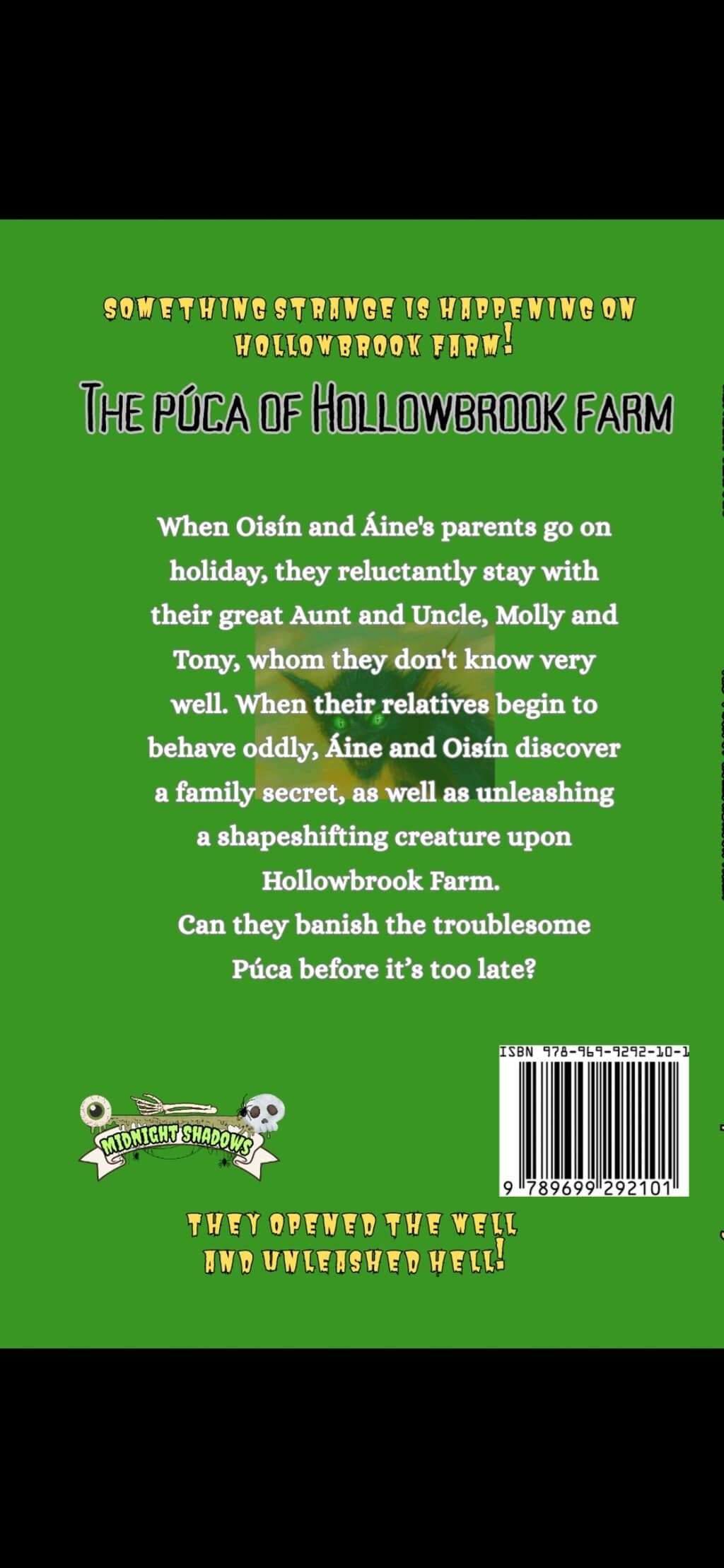 When Oisín and Áine’s parents go on holiday, they reluctantly stay with their great Aunt and Uncle, Molly and Tony, whom they don’t know very well. When their relatives begin to behave oddly, Áine and Oisín discover a family secret, as well as unleashing a shapeshifting creature upon Hollowbrook Farm.